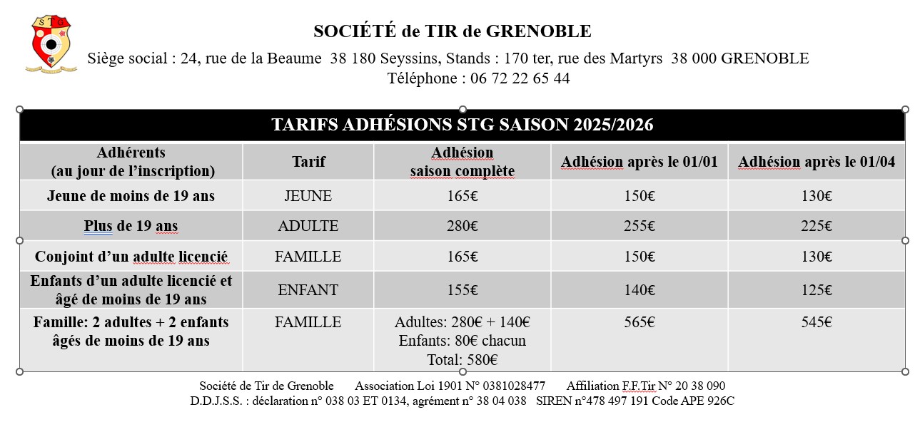 Tarifs d'adhésion à la STG - Saison 2025/2026
